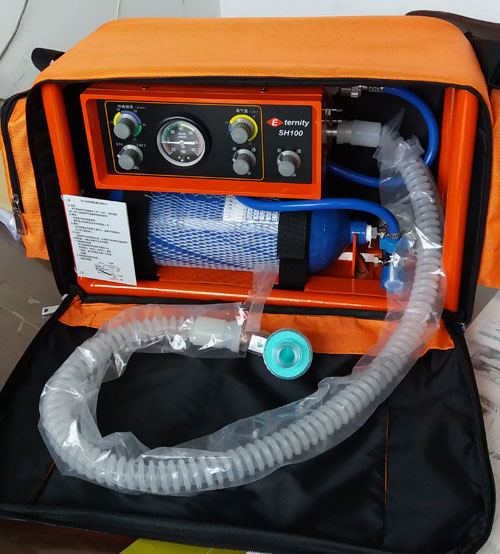 此款气控呼吸机可以在雨水浇淋的环境下继续工作,也能在有易燃易爆气体(如含有瓦斯的煤矿井下)或易燃易爆粉尘的环境中进行抢救,这些环境是能产生电火花的电控呼吸机的禁区。